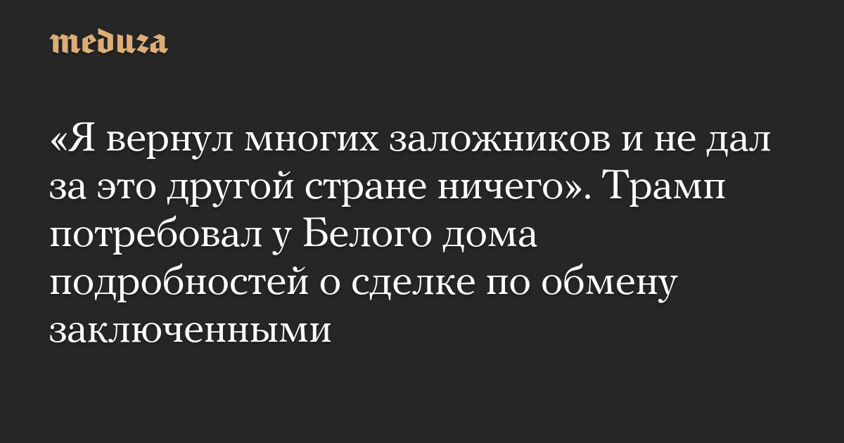 «Так когда же они [Белый дом] собираются опубликовать подробности обмена пленными с Россией? Сколько людей мы получили за тех, кого отдали? Мы тоже платим им наличными? Они платят нам наличными (пожалуйста, снимите этот вопрос, потому что я уверен, что ответ НЕТ)? Освобождаем ли мы убийц, киллеров или головорезов? Просто любопытно, потому что мы никогда не заключаем выгодных сделок ни в чем, особенно в обмене заложниками», — написал Трамп в своей соцсети Truth.