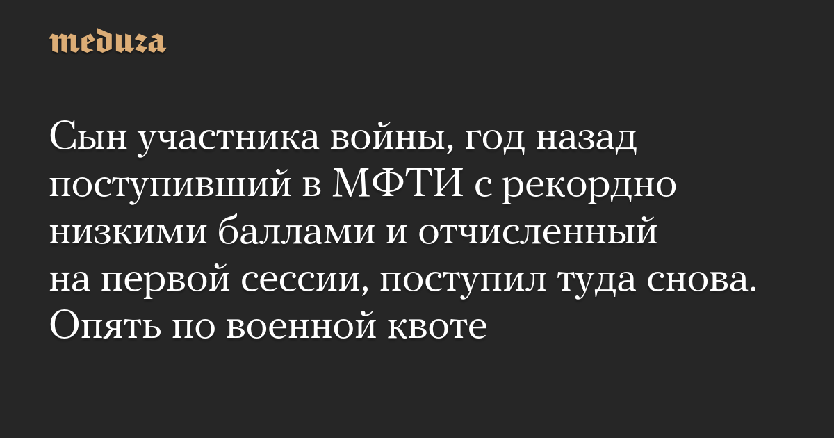 Сын участника войны, год назад поступивший в МФТИ с рекордно низкими баллами и отчисленный на первой сессии, поступил туда снова. Опять по военной квоте