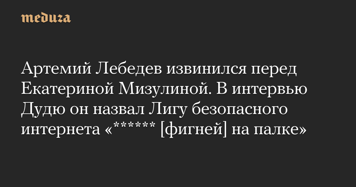 Артемий Лебедев извинился перед Екатериной Мизулиной. В интервью Дудю он назвал Лигу безопасного интернета «****** [фигней] на палке»