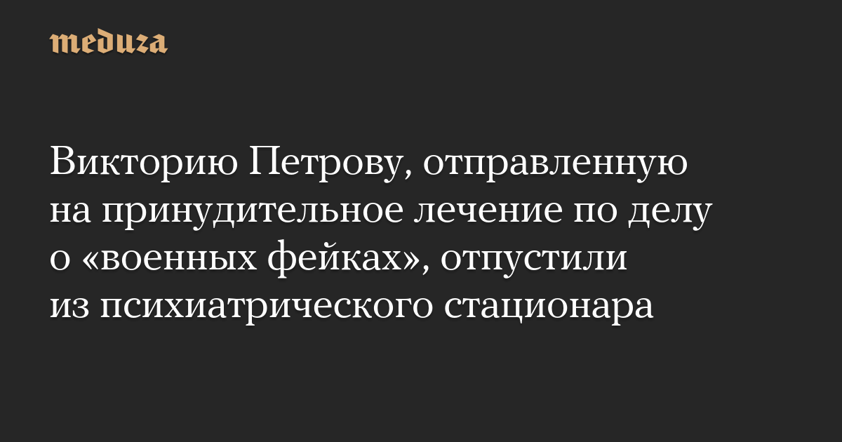Обвинявшуюся в распространении «военных фейков» жительницу Санкт-Петербурга Викторию Петрову, которой суд в декабре 2023 года назначил принудительное лечение, отпустили из психиатрической больницы.