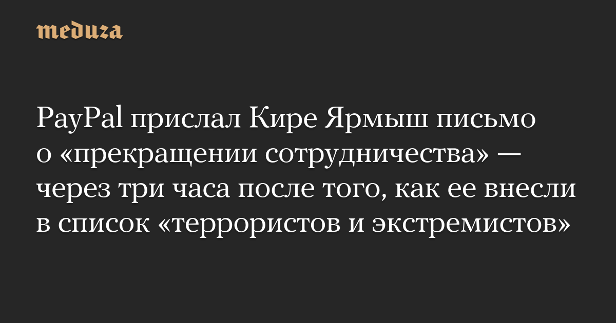 PayPal прислал пресс-секретарю Юлии Навальной Кире Ярмыш письмо о прекращении сотрудничества после того, как ее внесли в перечень «террористов и экстремистов», рассказала она в своих соцсетях.