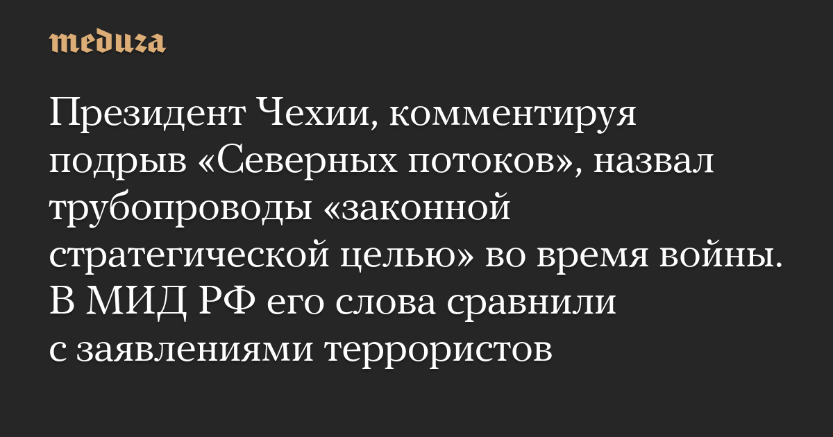 Президент Чехии, комментируя подрыв «Северных потоков», назвал трубопроводы «законной стратегической целью» во время войны. В МИД РФ его слова сравнили с заявлениями террористов
