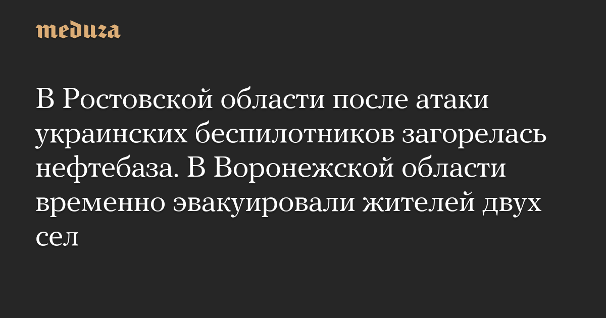 В Ростовской области после атаки украинских беспилотников загорелась нефтебаза. В Воронежской области временно эвакуировали жителей двух сел