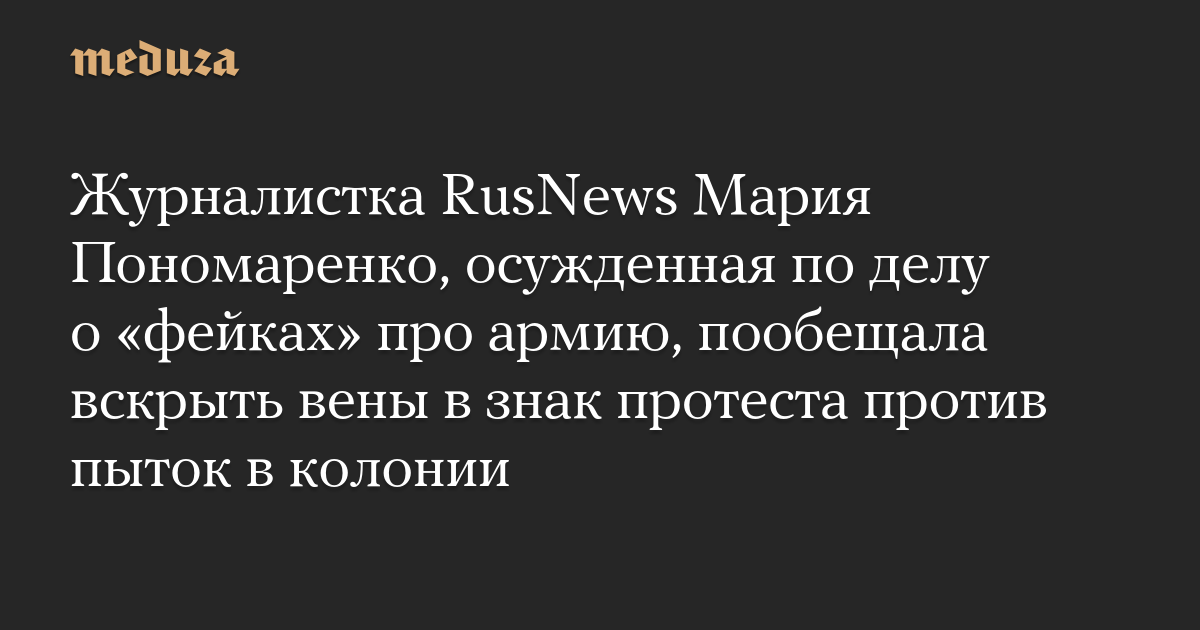 Журналистка RusNews Мария Пономаренко, осужденная по делу о «фейках» про армию, пообещала вскрыть вены в знак протеста против пыток в колонии