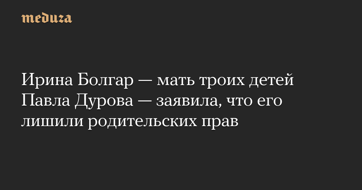 Жительница Швейцарии Ирина Болгар, называющая себя матерью троих детей основателя Telegram Павла Дурова, заявила, что швейцарский суд лишил Дурова родительских прав на их детей. Болгар рассказала 29 августа в инстаграме, что такое решение вынес Трибунал по защите детей и взрослых в Женеве по результатам расследования, которое органы опеки провели по ее заявлению.