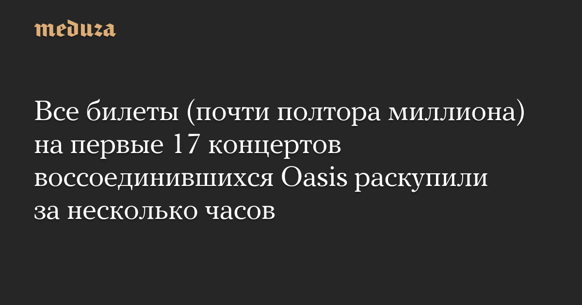 Все билеты на концерты Oasis в Великобритании и Ирландии были распроданы за 10 часов после старта продаж, сообщила группа в соцсетях.