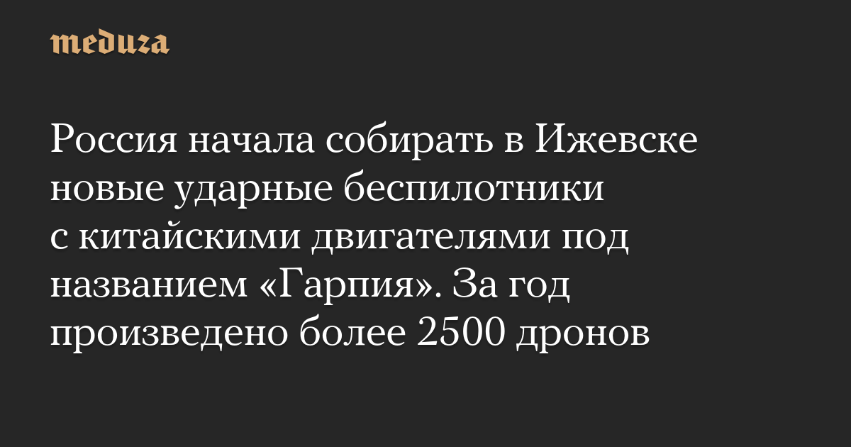 Россия начала собирать в Ижевске новые ударные беспилотники с китайскими двигателями под названием «Гарпия». За год произведено более 2500 дронов