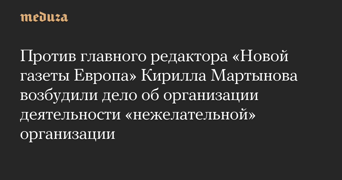 Следственный комитет России возбудил в отношении главного редактора «Новой газеты Европа» Кирилла Мартынова уголовное дело об организации деятельности «нежелательной» организации, сообщили российские государственные агентства ТАСС и РИА Новости со ссылкой на правоохранительные органы.