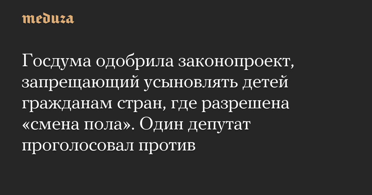 Госдума одобрила законопроект, запрещающий усыновлять детей гражданам стран, где разрешена «смена пола». Один депутат проголосовал против