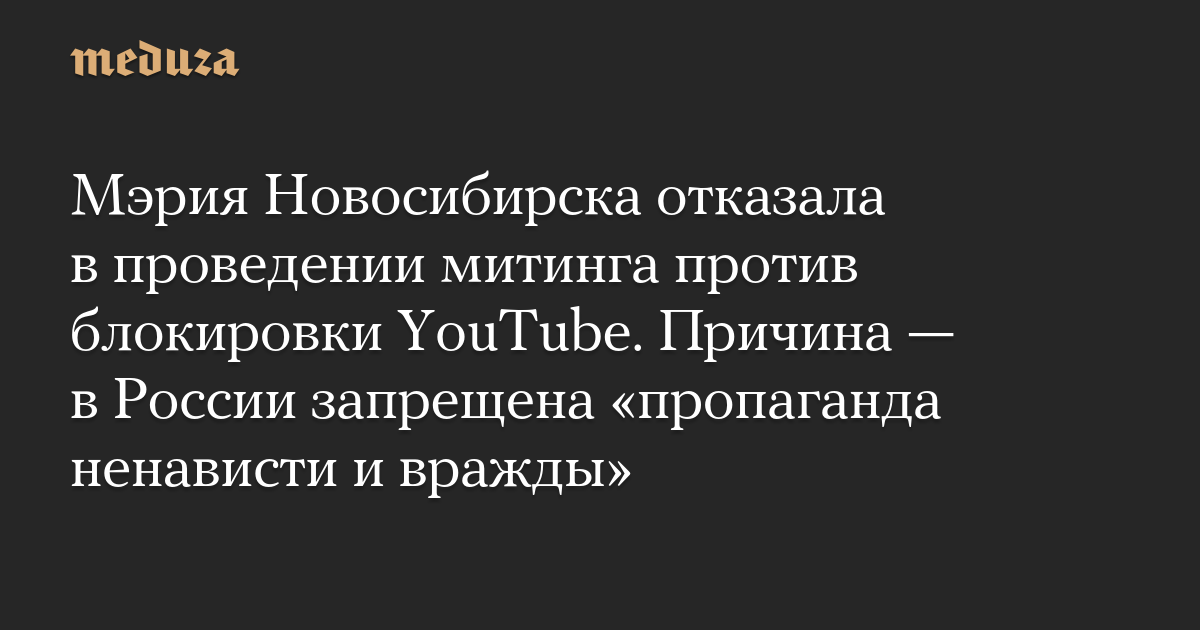 Мэрия Новосибирска отказала в проведении митинга против блокировки YouTube. Причина — в России запрещена «пропаганда ненависти и вражды»
