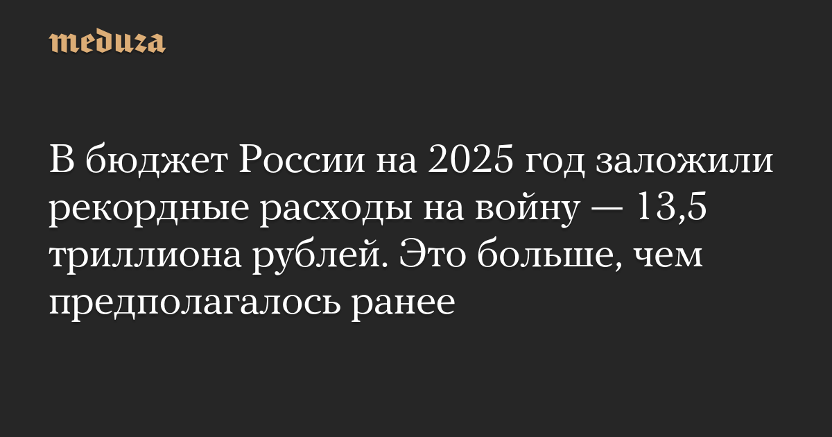 В бюджет России на 2025 год заложили рекордные расходы на войну — 13,5 триллиона рублей. Это больше, чем предполагалось ранее
