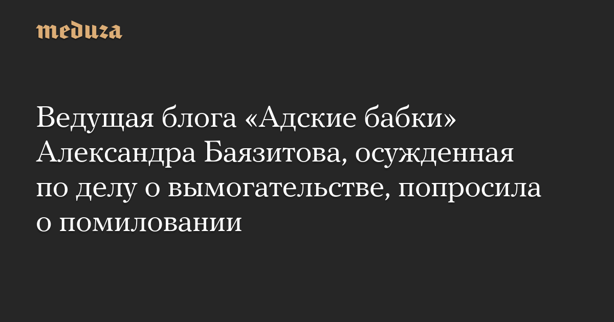 Журналистка и ведущая блога «Адские бабки» Александра Баязитова, отбывающая пятилетний срок в колонии во Владимирской области по делу о вымогательстве, написала прошение о помиловании. Об этом РИА Новости сообщила член совета по правам человека при президенте РФ Ева Меркачева.