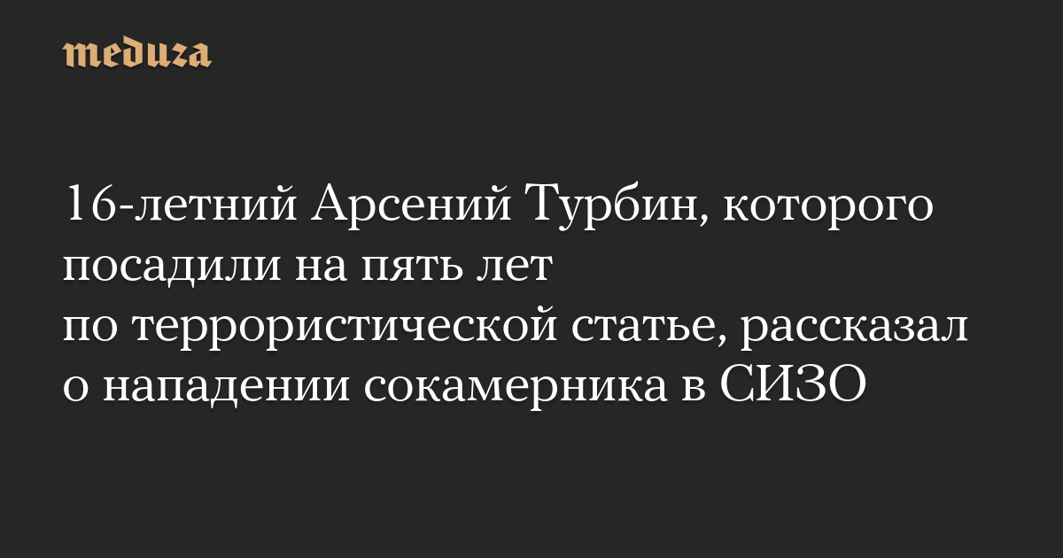На 16-летнего Арсения Турбина, которого приговорили к пяти годам воспитательной колонии по делу об участии в террористической организации, напал сокамерник в московском СИЗО-5 «Водник». Об этом, пишет «Медиазона», школьник рассказал матери в письме. Его фрагмент также опубликовал телеграм-канал группы поддержки Турбина.