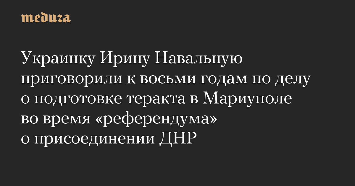 Южный окружной военный суд Ростова-на-Дону приговорил 26-летнюю уроженку Мариуполя Ирину Навальную к восьми годам колонии общего режима по обвинению в подготовке теракта во время «референдума» о присоединении самопровозглашенной ДНР к России в сентябре 2022 года, передает «Медиазона» со ссылкой на адвоката.