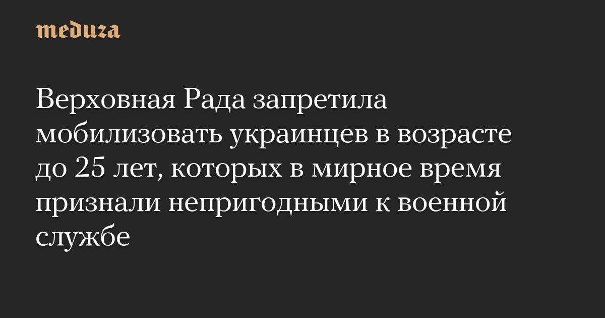 Как уточняет «РБК-Украина», закон призван предоставить отсрочку от мобилизации военнообязанным, которых по состоянию здоровья признали непригодными к военной службе в мирное время и ограниченно пригодными во время войны. В период военного положения и до достижения 25-летнего возраста таких украинцев могут мобилизовать только с их согласия.