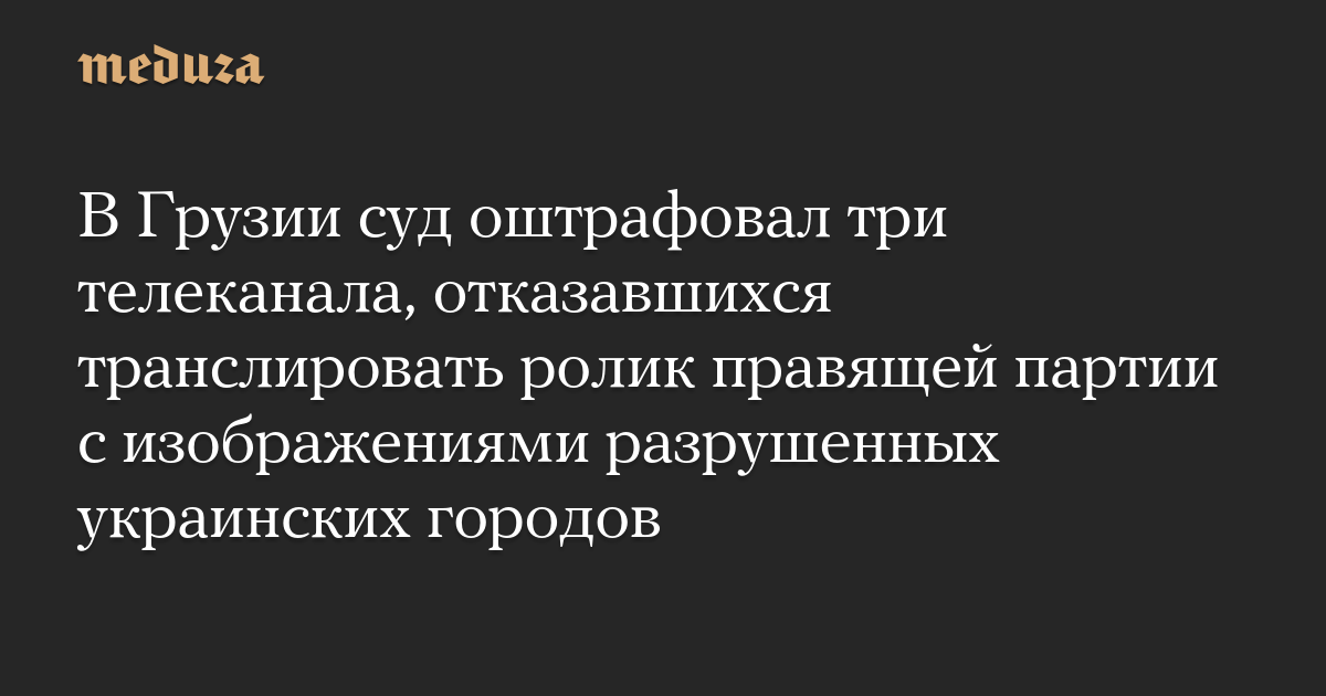 Тбилисский городской суд удовлетворил иск правящей партии «Грузинская мечта» и назначил штрафы телеканалам «Формула», «Мтавари архи» и «TV Пирвели», которые отказались ставить в эфир предвыборный ролик партии с изображениями разрушенных украинских городов.