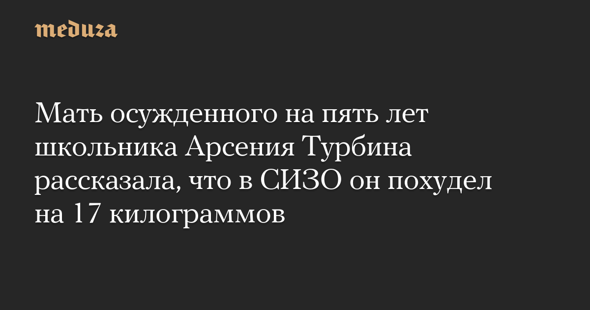 16-летний Арсений Турбин, которого приговорили к пяти годам воспитательной колонии по делу об участии в террористической организации, похудел в московском СИЗО-5 «Водник» на 17 килограммов. Об этом рассказала группа поддержки заключенного со ссылкой на его мать Ирину Турбину.