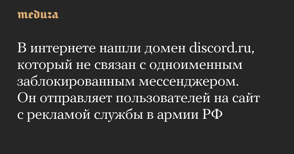 Пользователи соцсетей обнаружили домен discord.ru, который использует название одноименного мессенджера, но перенаправляет на сайт с призывом заключить контракт с российской армией. На сообщения об этом обратили «Гроза» и «Бумага».
