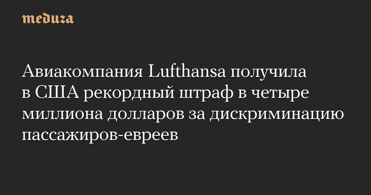 Министерство транспорта США назначило немецкой авиакомпании Lufthansa рекордный по размеру штраф в четыре миллиона долларов из-за дискриминации пассажиров-евреев, сообщается в релизе Минтранса.