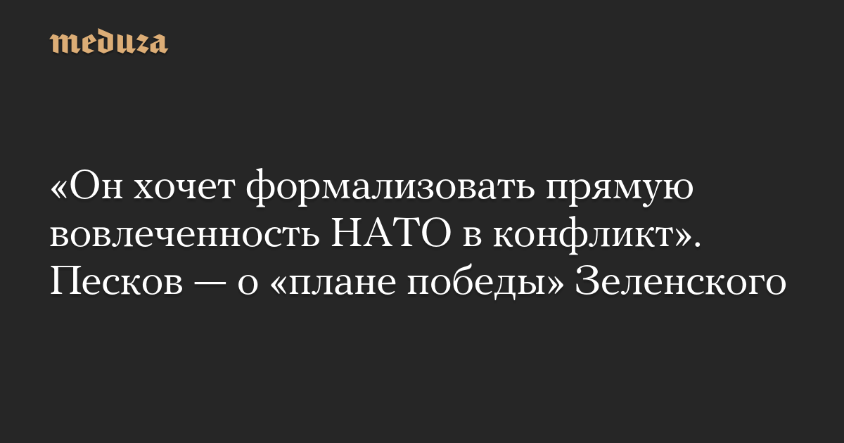 «Основная подноготная „плана“ заключается в том, что он [Зеленский] хочет формализовать прямую вовлеченность НАТО в конфликт вокруг Украины. Вот в этом суть того, что, по крайней мере, было изложено, то, что дошло до мировой общественности. То есть он говорит: да, ребята, вы до этого участвовали, но как бы неофициально. А теперь давайте мы сделаем это официально, давайте НАТО будет здесь. Это недальновидно, безрассудно, нелогично в его ситуации», — цитирует «Интерфакс» представителя Кремля.