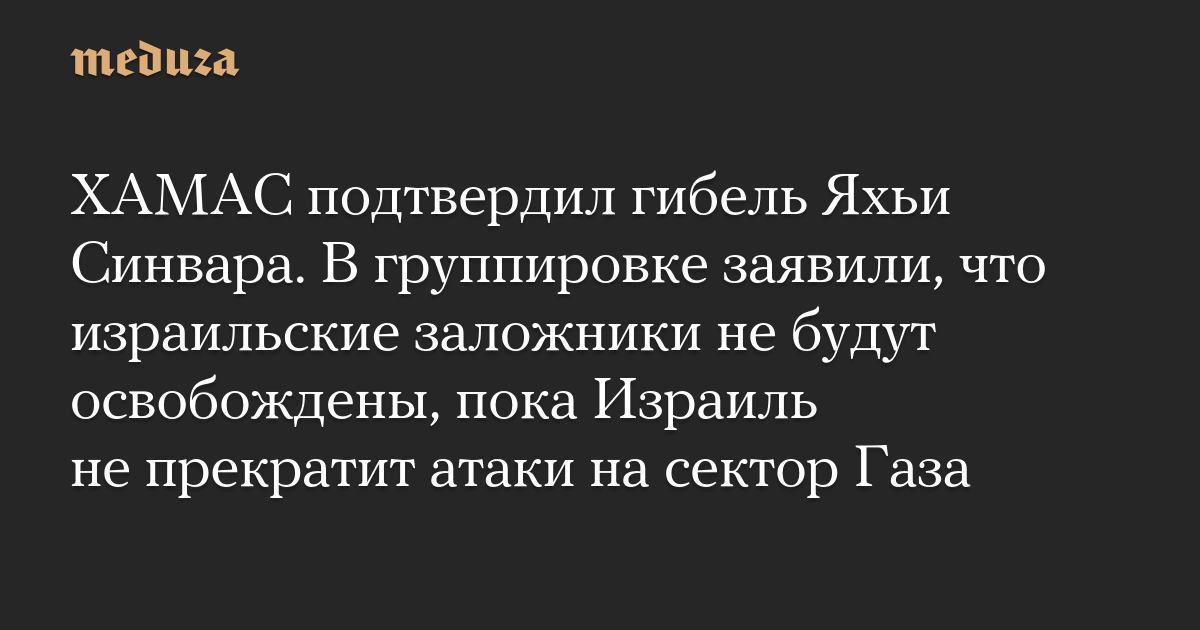 ХАМАС подтвердил гибель Яхьи Синвара. В группировке заявили, что израильские заложники не будут освобождены, пока Израиль не прекратит атаки на сектор Газа