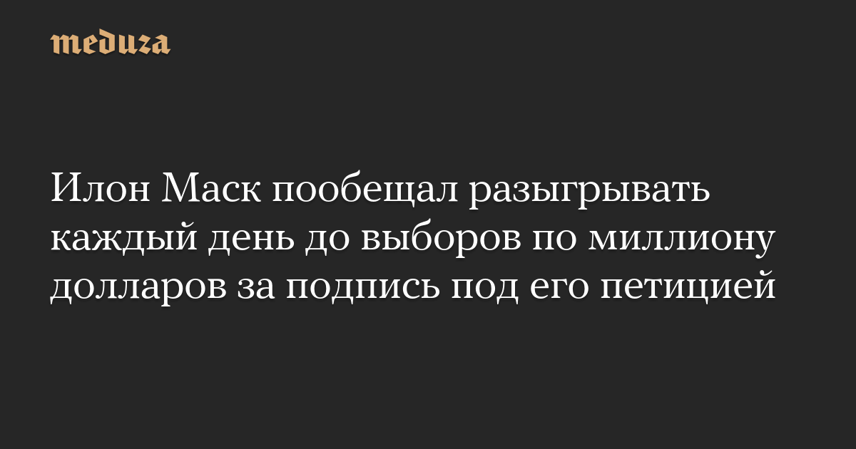 Илон Маск пообещал разыгрывать каждый день до выборов по миллиону долларов за подпись под его петицией