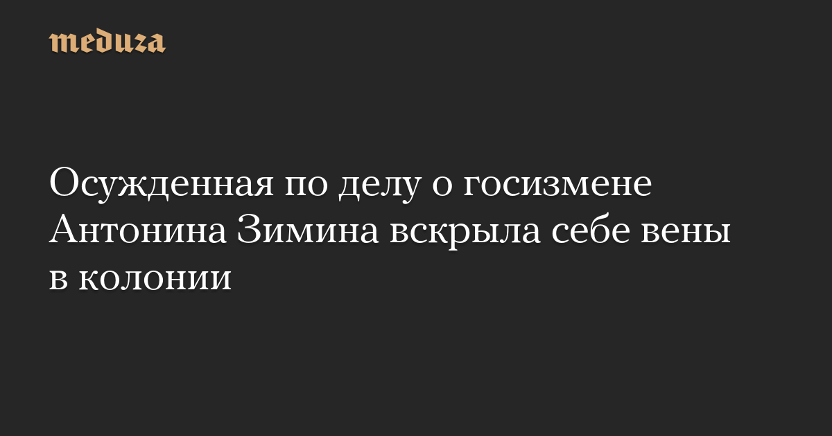Антонина Зимина, осужденная на 13 лет по делу о госизмене, вскрыла себе вены в колонии из-за «систематического нарушения ее прав». Об этом сообщил правозащитный проект «Женский срок» со ссылкой на письмо, которое получили близкие Зиминой.