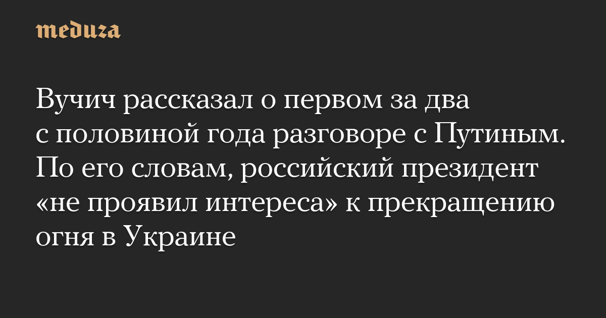 Президент Сербии Александр Вучич рассказал, что в первом за два с половиной года телефонном разговоре с Владимиром Путиным он поднял тему прекращения огня в Украине, но российский президент «похоже, не проявил интереса», пишет Bloomberg.