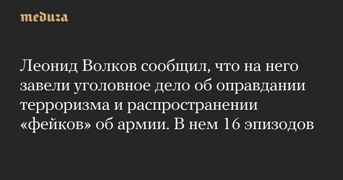 Леонид Волков сообщил, что на него завели уголовное дело об оправдании терроризма и распространении «фейков» об армии. В нем 16 эпизодов
