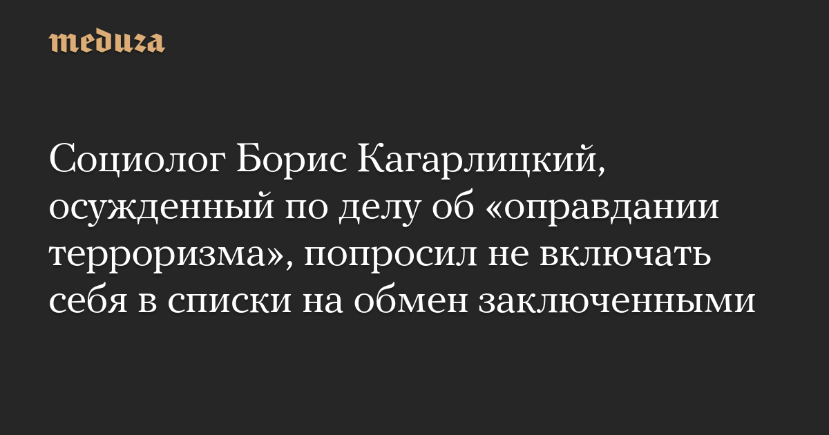 Социолог и публицист Борис Кагарлицкий, приговоренный к пяти годам колонии по обвинению в «оправдании терроризма», заявил, что отказывается быть участником возможных обменов заключенными между Россией и Западом. Обращение Кагарлицкого опубликовано в телеграм-канале общественно-политического журнала «Рабкор», который он возглавляет.