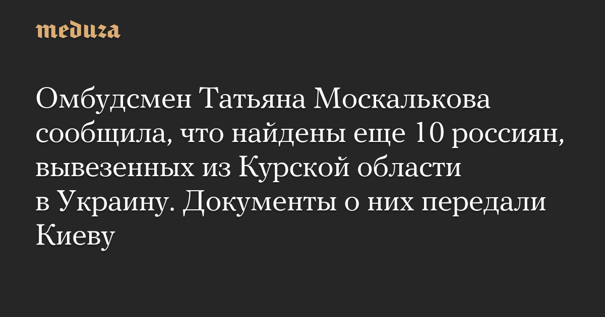 Омбудсмен Татьяна Москалькова сообщила, что найдены еще 10 россиян, вывезенных из Курской области в Украину. Документы о них передали Киеву