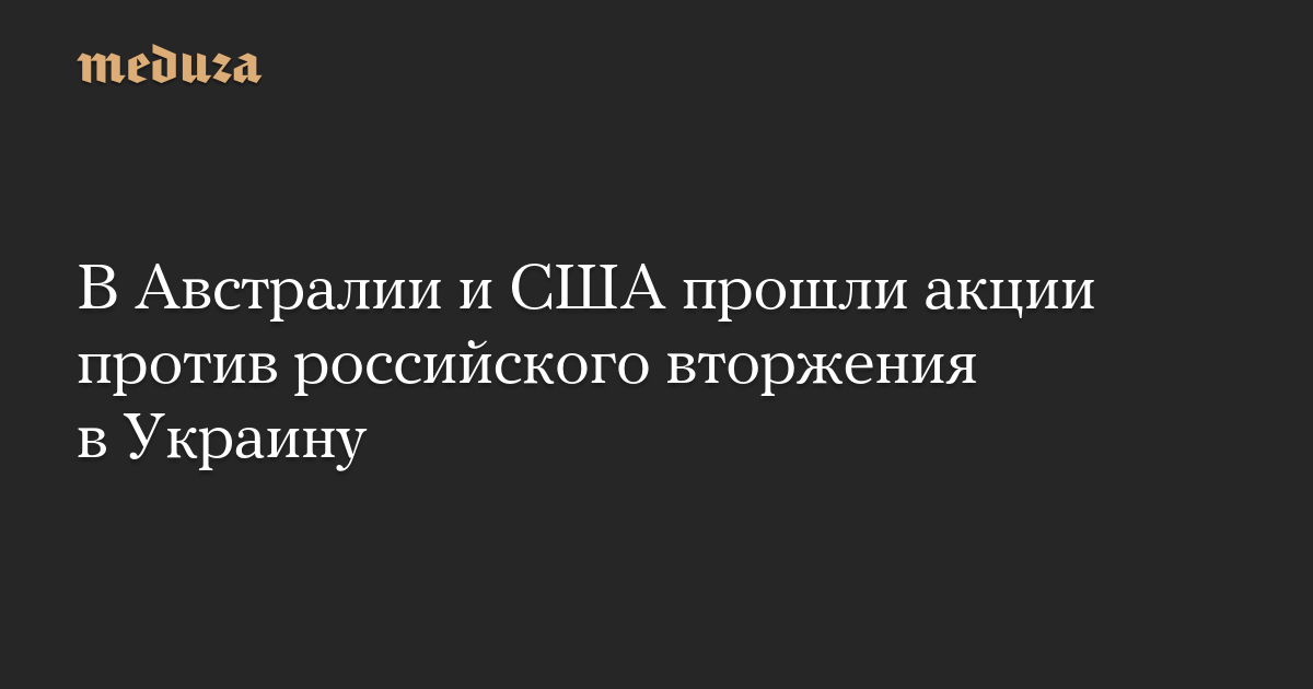 В австралийской Аделаиде и в Сан-Франциско в США прошли акции против российского вторжения в Украину. Фото и видео с акции в Аделаиде, полученные от подписчиков, опубликовал в своем телеграм-канале журналист Александр Плющев. Акции также прошли в Сиднее и Мельбурне, сообщили читатели «Медузы».