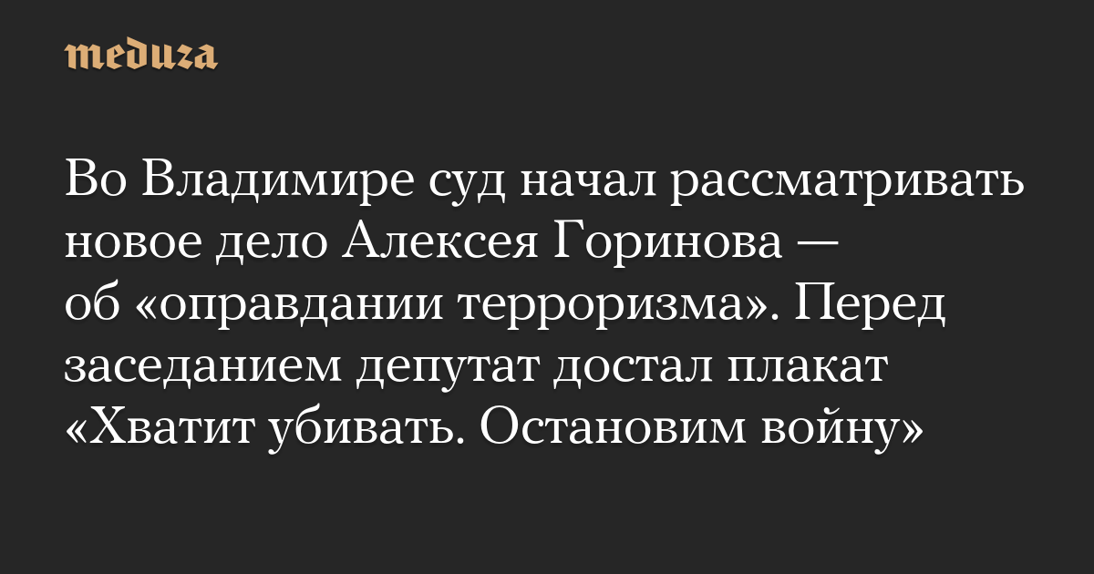 Во Владимире суд начал рассматривать новое дело Алексея Горинова — об «оправдании терроризма». Перед заседанием депутат достал плакат «Хватит убивать. Остановим войну»