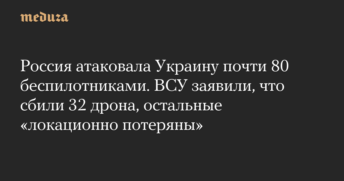 Россия атаковала Украину почти 80 беспилотниками. ВСУ заявили, что сбили 32 дрона, остальные «локационно потеряны»
