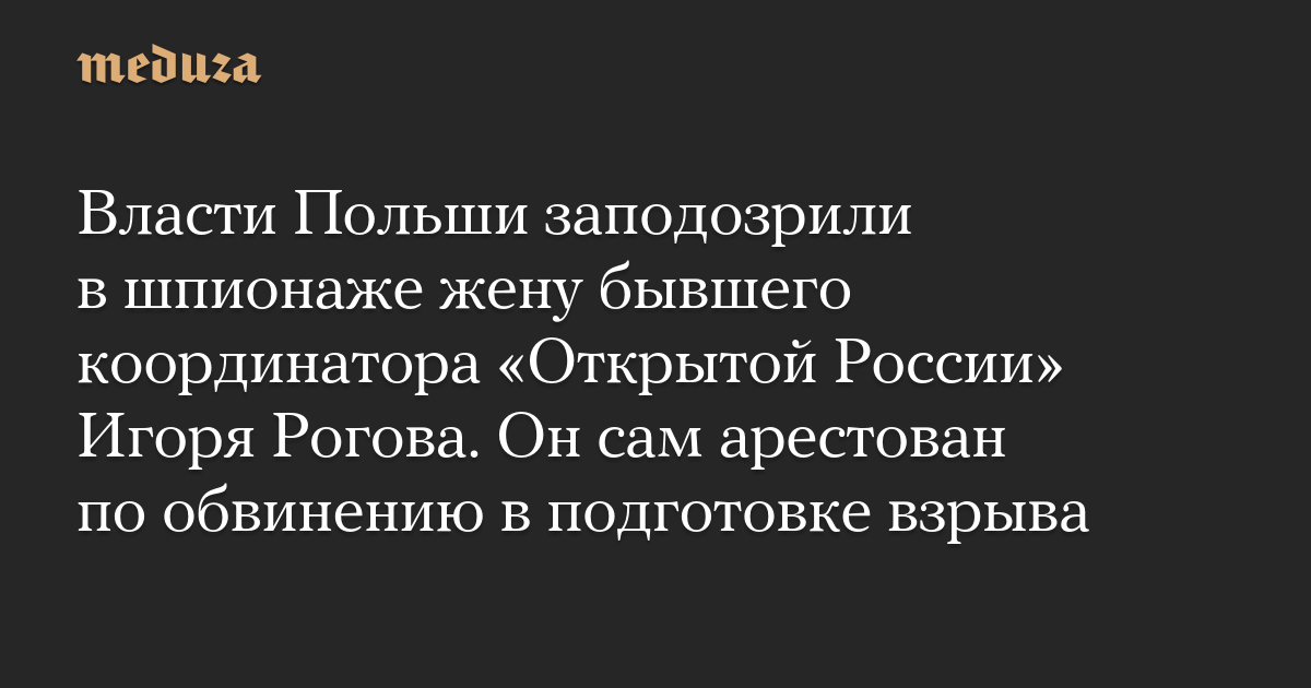 Власти Польши заподозрили в шпионаже жену бывшего координатора «Открытой России» Игоря Рогова. Он сам арестован по обвинению в подготовке взрыва