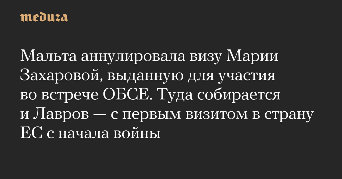 Мальта аннулировала визу Марии Захаровой, выданную для участия во встрече ОБСЕ. Туда собирается и Лавров — с первым визитом в страну ЕС с начала войны