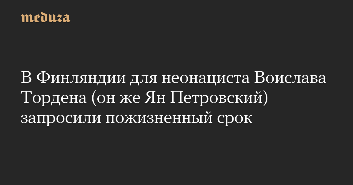 Государственный обвинитель попросил уездный суд Хельсинки приговорить российского неонациста и одного из командиров диверсионно-штурмовой разведывательной группы «Русич» Воислава Тордена (в прошлом — Ян Петровский) к пожизненному сроку заключения. Об этом сообщает финская телерадиокомпания Yle 5 декабря.