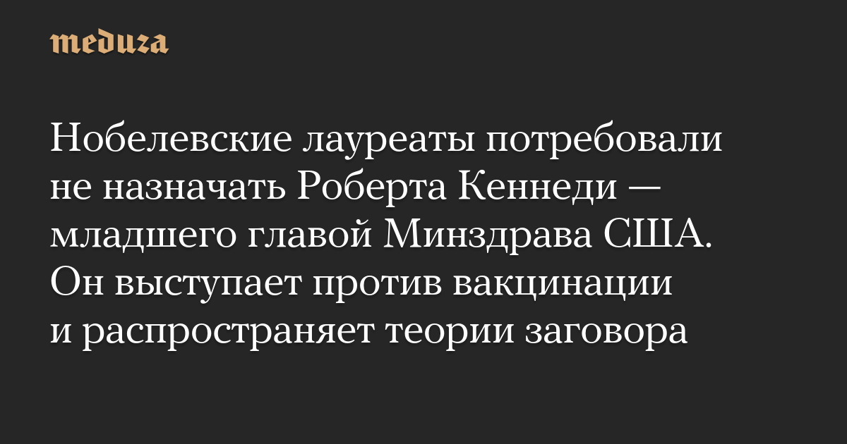 Нобелевские лауреаты потребовали не назначать Роберта Кеннеди — младшего главой Минздрава США. Он выступает против вакцинации и распространяет теории заговора