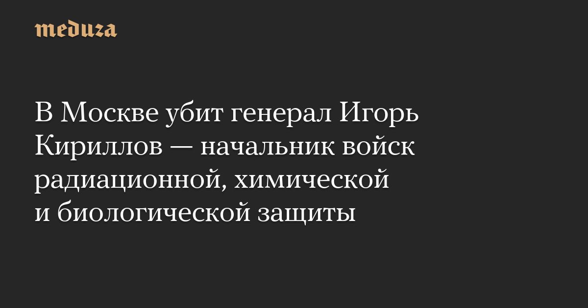 По данным телеграм-каналов Mash и «112», погибли начальник войск радиационной, химической и биологической защиты генерал-лейтенант Игорь Кириллов и его помощник. Кириллов известен тем, что с 2023 года проводил брифинги Минобороны РФ, в ходе которых, в частности, рассказывал о «военно-биологической деятельности» США в Украине. Телеграм-канал Baza пишет, что вместе с генералом погиб и его помощник Илья П. (его фамилия не приводится).