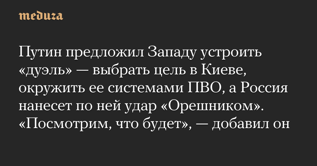 Путин предложил Западу устроить «дуэль» — выбрать цель в Киеве, окружить ее системами ПВО, а Россия нанесет по ней удар «Орешником». «Посмотрим, что будет», — добавил он