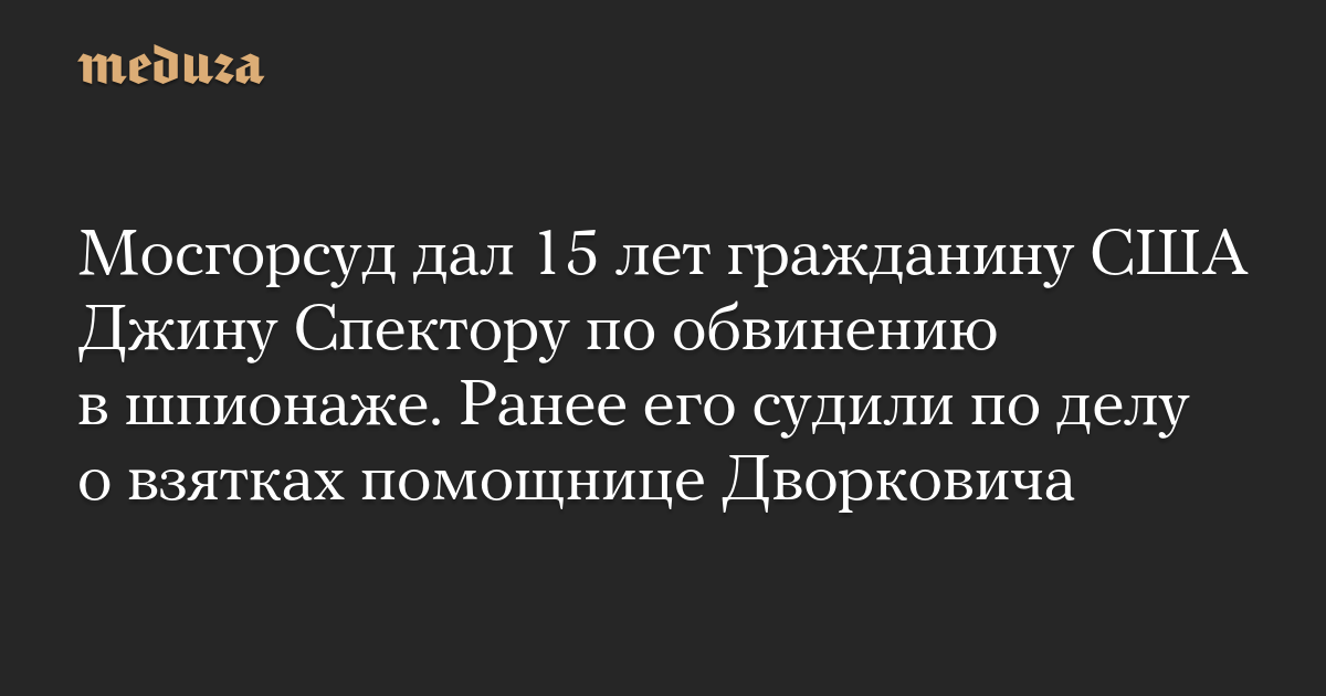 Мосгорсуд вынес наказание по совокупности с предыдущим приговором, по которому Спектора осудили по делу о посредничестве при даче взятки Анастасии Алексеевой — бывшей помощнице бывшего вице-премьера РФ Аркадия Дворковича. В сентябре 2022 года Спектору назначили по этому делу три с половиной года колонии. В августе 2023-го его арестовали по делу о шпионаже.