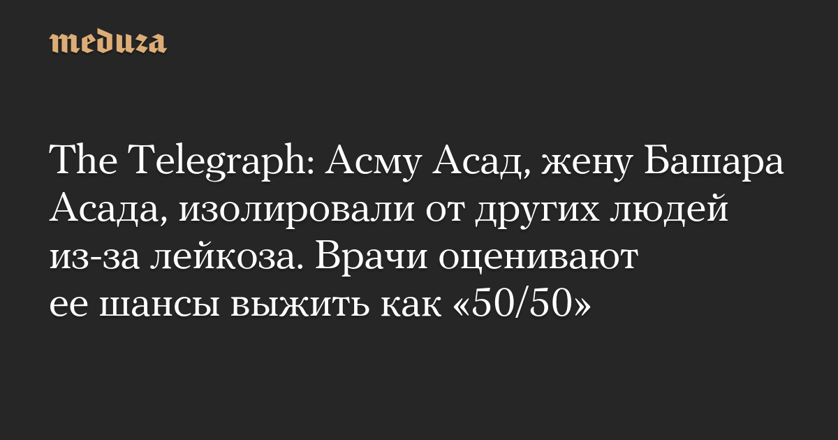 Врачи, которые занимаются лечением лейкоза жены бывшего президента Сирии Асмы Асад, изолировали ее от других людей. Они «оценивают ее шансы выжить как „50/50“», утверждают источники британской газеты The Telegraph.