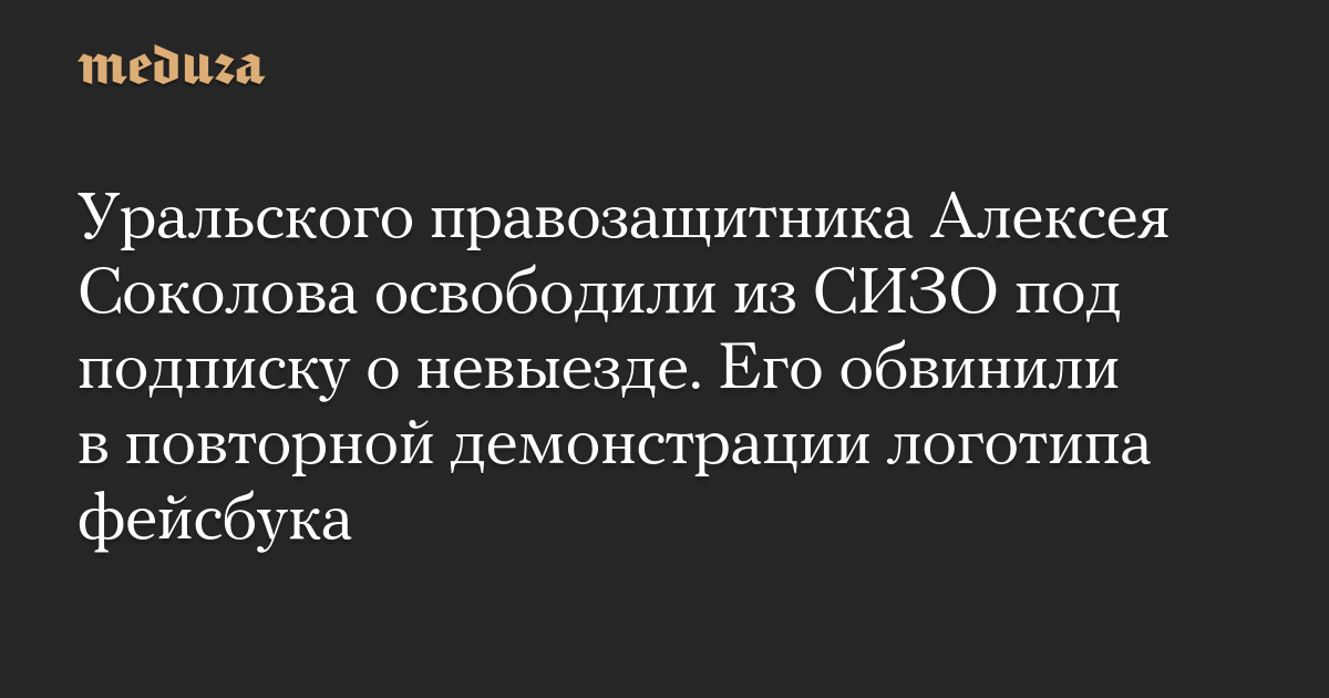 В Екатеринбурге из следственного изолятора освободили правозащитника Алексея Соколова, арестованного по делу о повторной демонстрации логотипа фейсбука (часть 1 статьи 282.4 УК), сообщил правозащитный проект «Сетевые свободы».