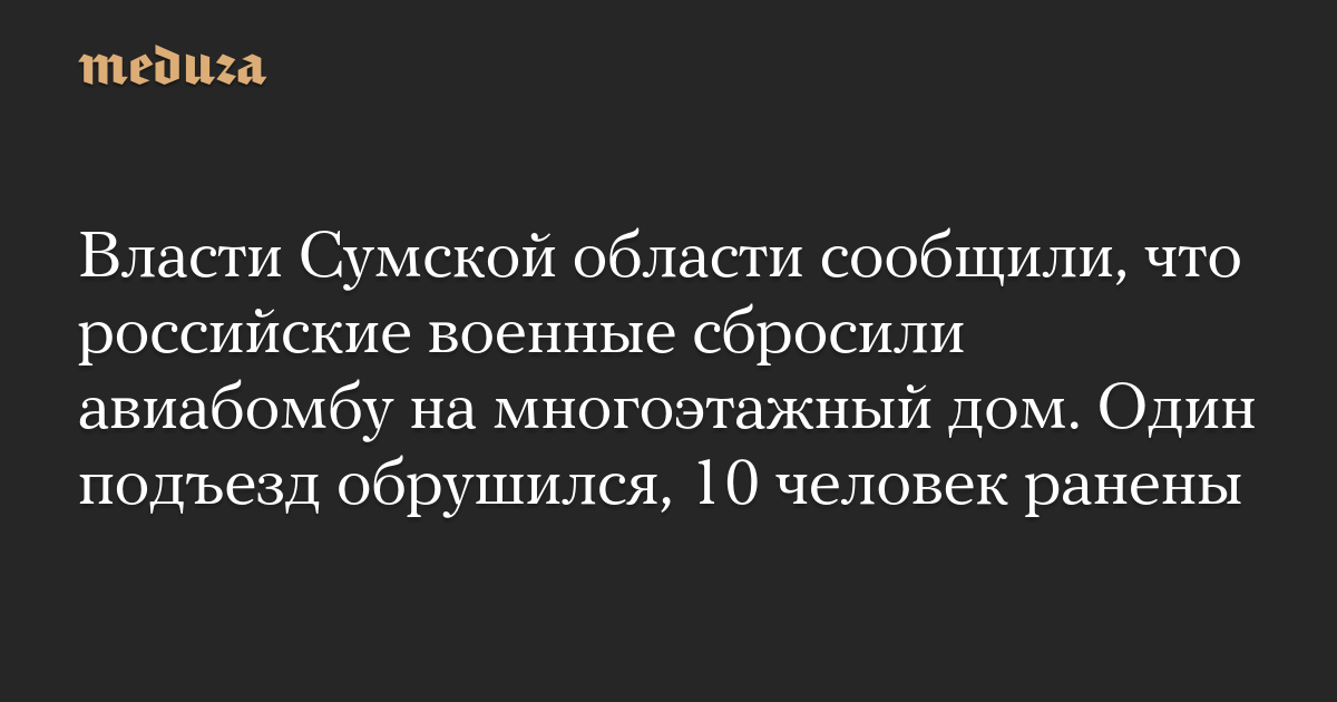 Власти Сумской области сообщили, что российские военные сбросили авиабомбу на многоэтажный дом. Один подъезд обрушился, 10 человек ранены