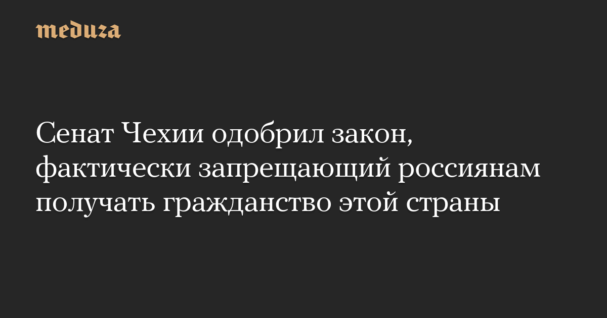 Сенат Чехии утвердил закон, который фактически запрещает россиянам получать гражданство этой страны, пишет «Радио Свобода». Закон под названием Lex Ukraine касается в основном продления временной защиты украинских беженцев, положения о паспортах для россиян внесены туда как поправки.