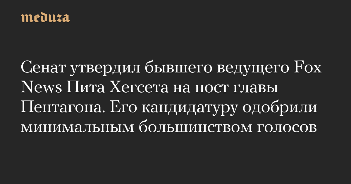 Сенат утвердил бывшего ведущего Fox News Пита Хегсета на пост главы Пентагона. Его кандидатуру одобрили минимальным большинством голосов