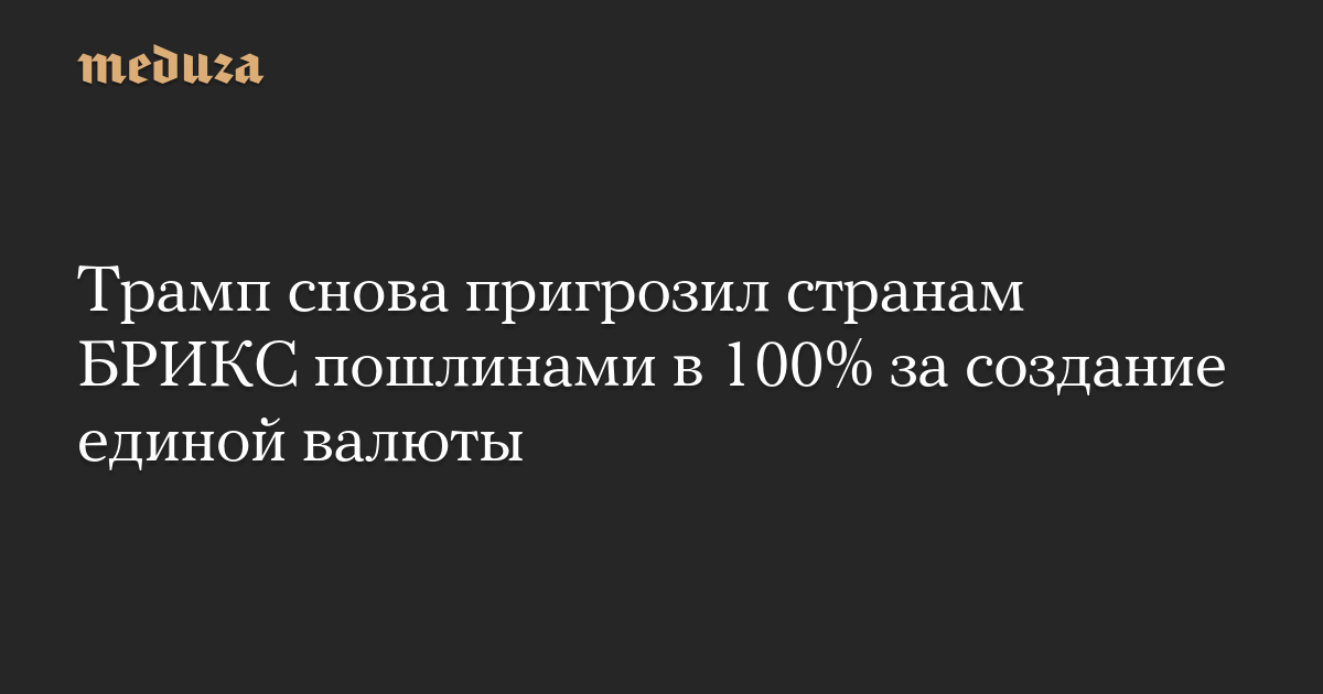 Президент США Дональд Трамп пригрозил 100-процентными пошлинами странам БРИКС за попытки создать новую валюту и отойти от доллара.