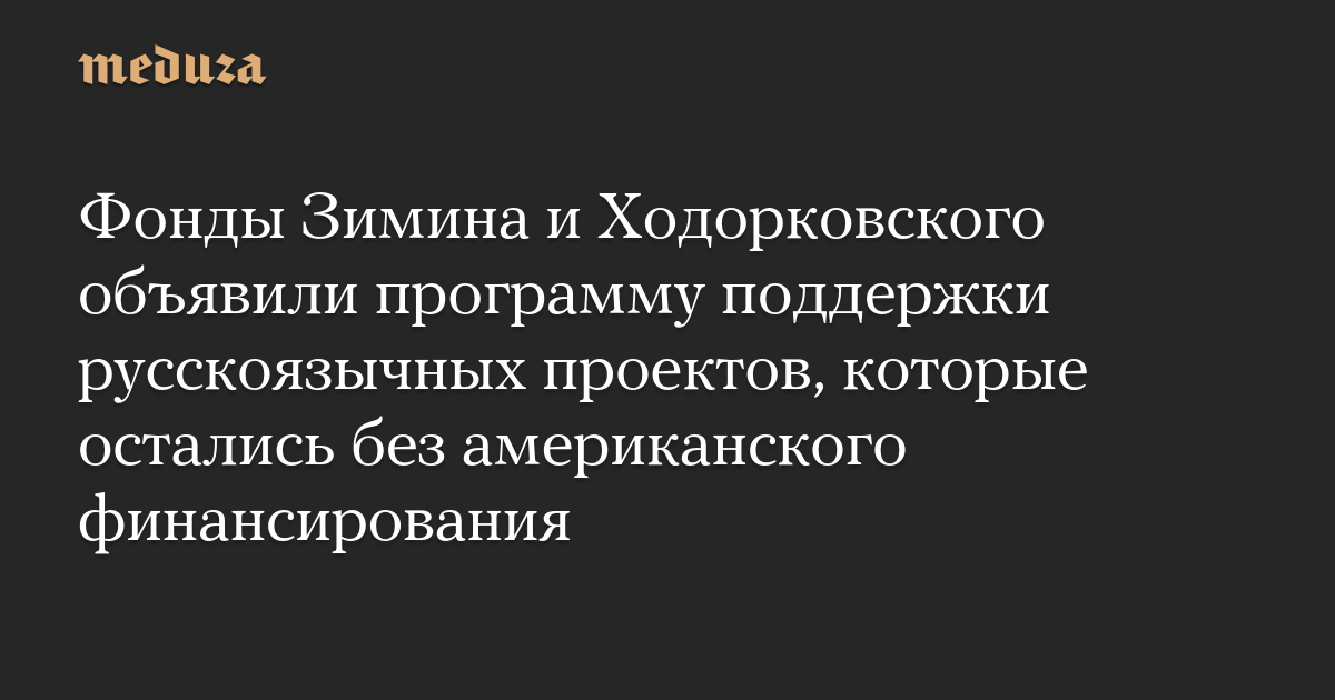 Фонды предпринимателей Бориса Зимина и Михаила Ходорковского объявили о программе поддержки для русскоязычных проектов, которые временно оказались без финансирования на фоне решения Госдепартамента США о заморозке программ иностранной помощи. Сообщения об этом опубликованы в телеграм-каналы Ходорковского и Zimin Foundation.