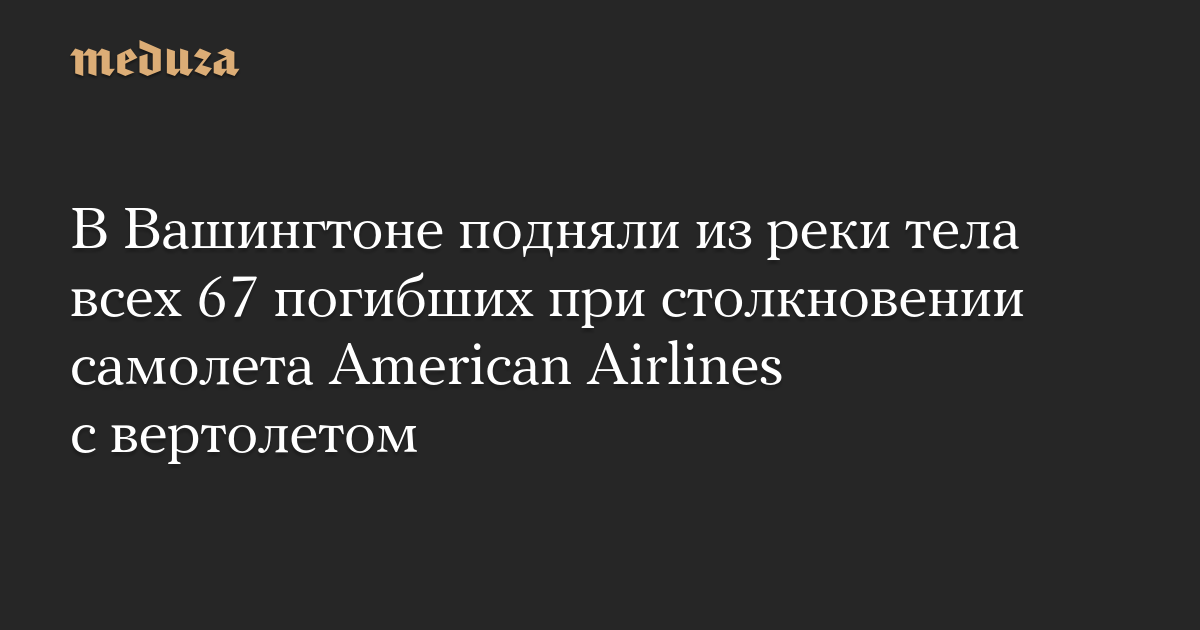 Из реки Потомак подняли тела всех 67 погибших в результате столкновения самолета American Airlines с армейским вертолетом в Вашингтоне. Об этом сообщило Associated Press со ссылкой на местные власти.
