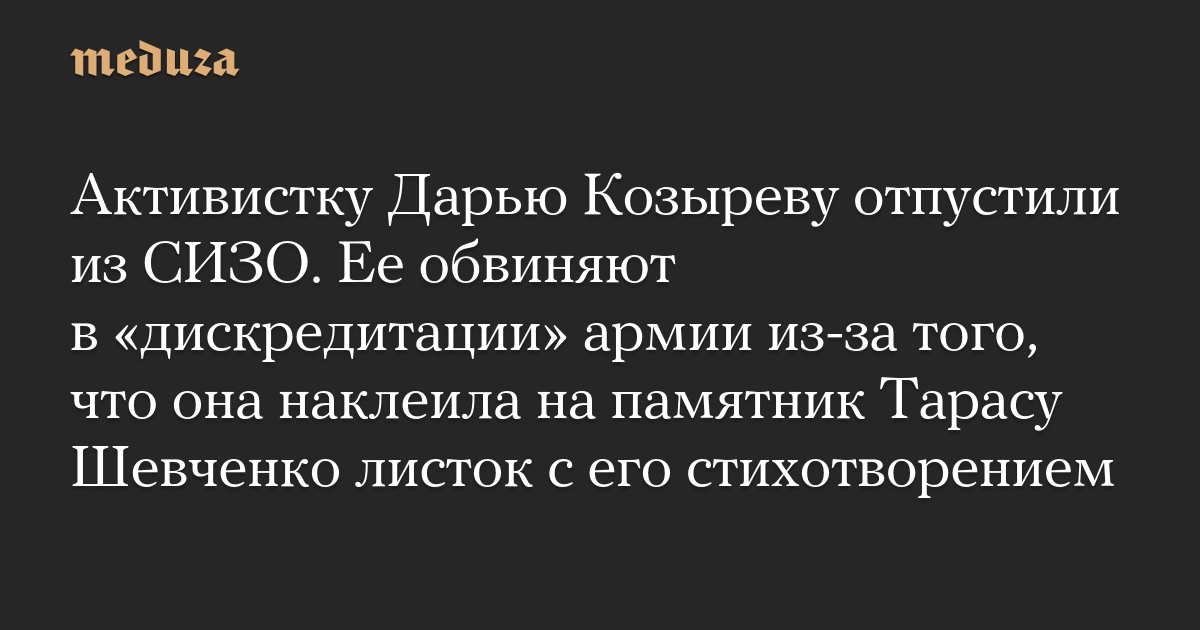Активистку Дарью Козыреву отпустили из СИЗО. Ее обвиняют в «дискредитации» армии из-за того, что она наклеила на памятник Тарасу Шевченко листок с его стихотворением